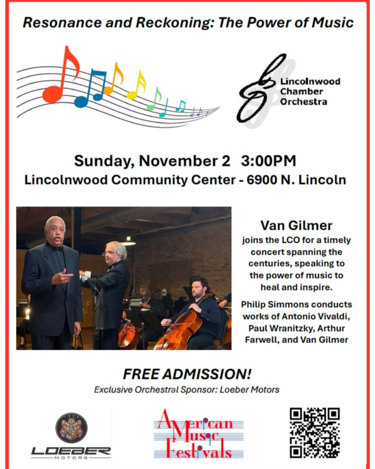 Join the Lincolnwood Chamber Orchestra for Resonance and Reckoning: The Power of Music, a free community concert celebrating the timeless connection between sound, spirit, and healing. 🎶 Conducted by Philip Simmons, the program features works by Antonio Vivaldi, Paul Wranitzky, Arthur Farwell, and Van Gilmer, who also joins the ensemble as a featured guest. 📅 Date: Sunday, November 2 🕒 Time: 3:00 PM 📍 Location: Lincolnwood Community Center – 6900 N. Lincoln 🎟 Free Admission (sponsored by Loeber Motors and American Music Festivals) Enjoy an afternoon of harmony and inspiration through the universal language of music.