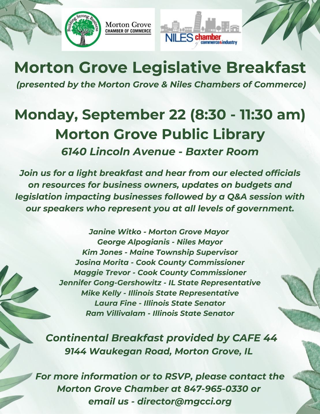 Join the Morton Grove and Niles Chambers of Commerce for a light breakfast and hear from our elected officials on resources for business owners, updates on budgets and legislation impacting businesses followed by a Q&A session with our speakers who represent you at all levels of government.
